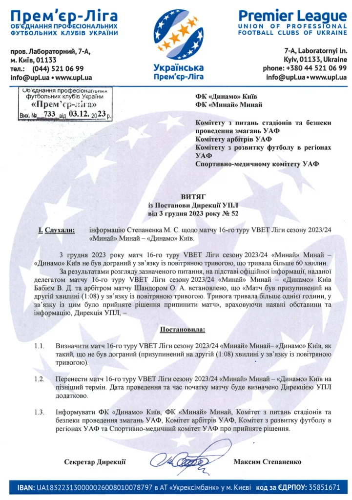 Минай – Динамо: УПЛ оголосила офіційне рішення щодо скандального поєдинку