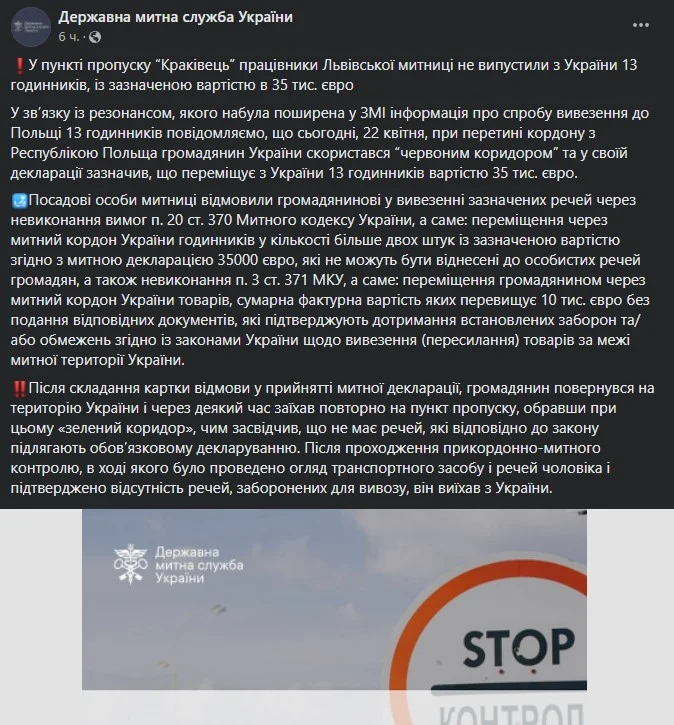Пізніше, цей громадянин повернувся на територію України, після чого знову прибув на пункт пропуску та продемонстрував, що не має з собою вищезгаданих годинників та інших речей, які заборонено вивозити з території країни.