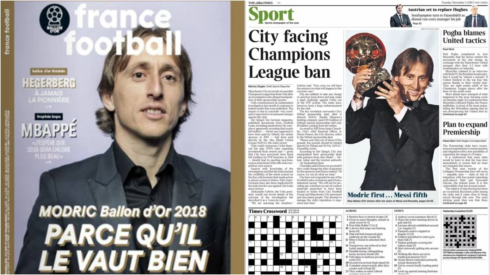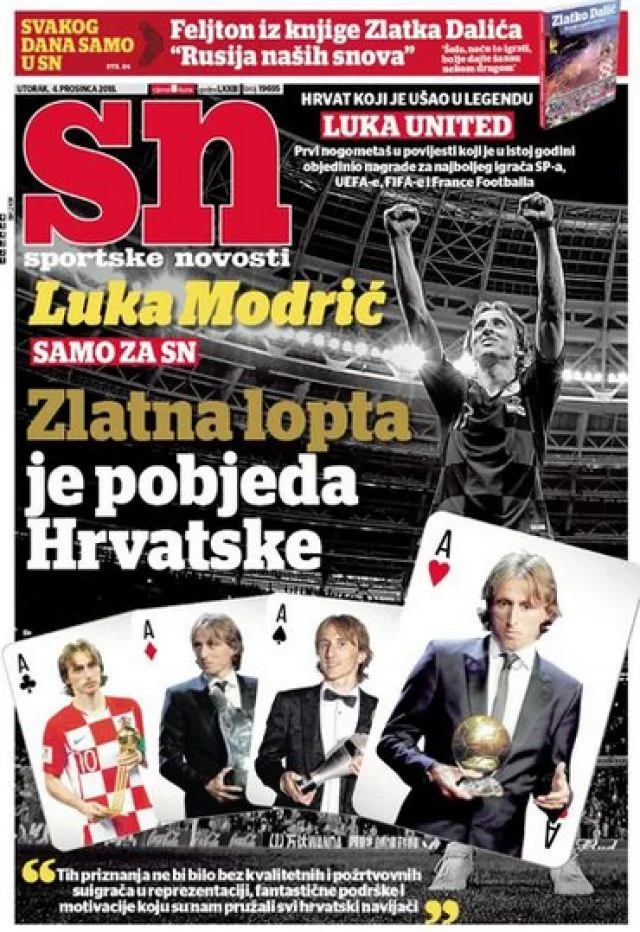 "Лука Юнайтед". Хорватська газета "Sportske Novosti" не натякає на перехід півзахисника в Манчестер, а просто в оригінальній формі карт перелічує всі нагороди, які їхній земляк зібрав у 2018-му році. "Найкращий з найкращих увійшов в історію. Хорватська футбольна казка у Парижі", – пише Jutarnji list. Перший в історії володар Золотого м'яча з Хорватії. Рівно 20 років тому Давор Шукер, бронзовий медаліст ЧС-1998, поступився лише великому переможцю домашнього Мундіалю Зінедіну Зідану – дубль у фіналі проти Бразилії, а цього більш ніж достатньо для перемоги.