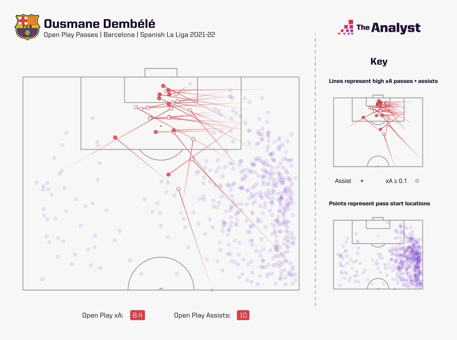 Як правило, їм передував прорив правим флангом на дриблінгу. В цьому плані Усман є найактивнішим і найефективнішим футболістом Барселони – він виконав 58 успішних обіграшів один в один з 98 спроб. І це за половину сезону!