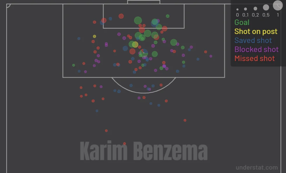 Карта ударів Бензема у сезоні Ла Ліги 2021/22 / натисніть, щоб збільшити