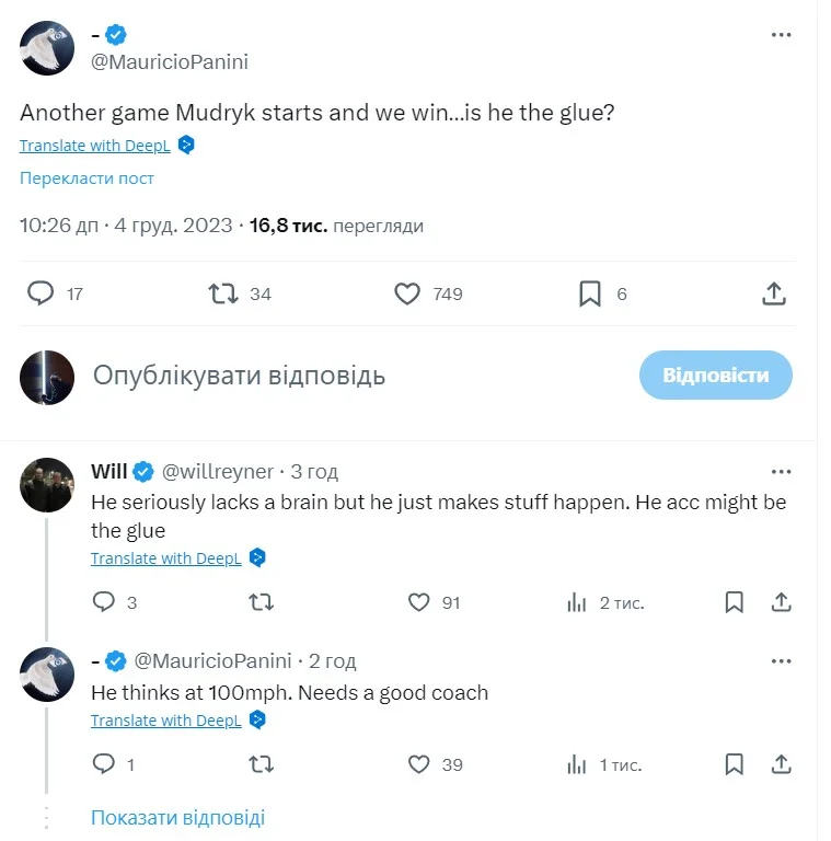 Вболівальники у соцмережах обговорюють, що Мудрик має фантастичні дані та може вийти на топ-рівень з хорошим тренером. Додатковий показник його корисності – Челсі останнім часом не програє, коли Михайло виходить у старті.