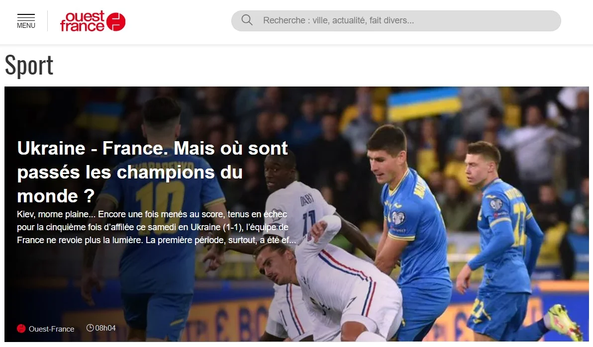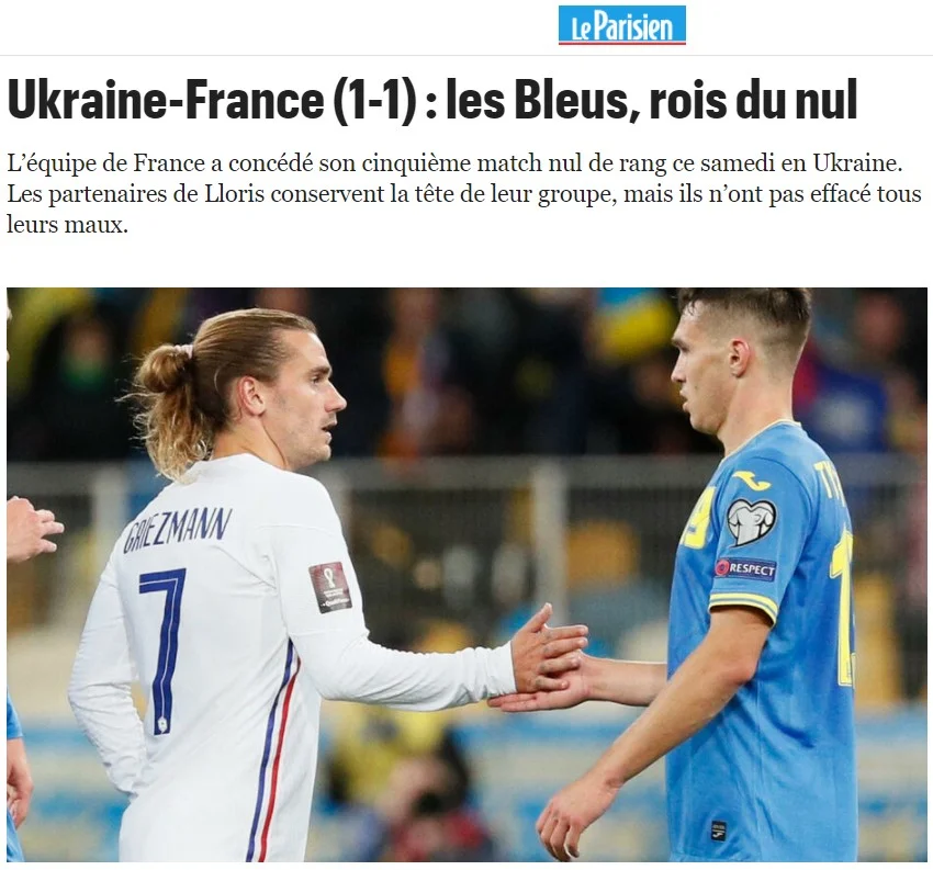 Збірна України розійшлася миром (1:1) з французами у кваліфікації до ЧС-2022. Реакція тамтешньої преси на проблеми чемпіонів світу та солідність "синьо-жовтих" – в нашому матеріалі.