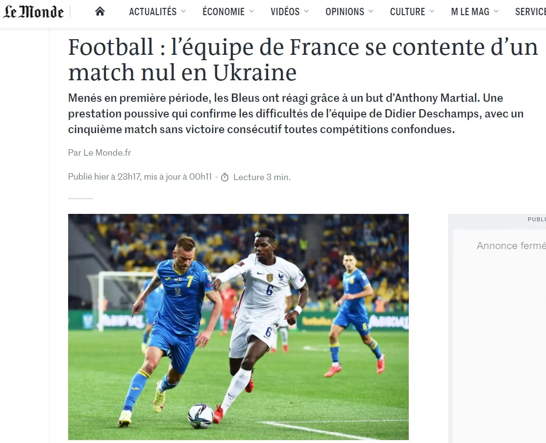 У снодійному першому таймі Франція показала те ж обличчя, що й з Боснією: безідейно, без чітких атакувальних патернів, з нервовою обороною. Шапаренко приголомшив холодним душем – забив красивим ударом у верхній кут. Провальний футбол, який треба стерти з пам'яті. Попри хорошу гру Чуамені та активність Погба, "Ле Бльо" не перемогли. Лише нічия на ворожій київській землі", – констатує Le Monde.