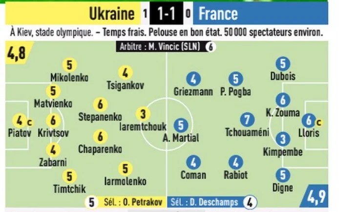 L'Equipe виставила оцінки футболістам обох команд. У французів найкращим став молодий хавбек Чуамені, а серед українців найвищі бали отримав середній блок – у Шапаренка, Степаненка та Кривцова по 6. Розчарував журналістів Яремчук, якому поставили лише 3. Олександр Петраков отримав 5, а Дідьє Дешам – 4. Тобто український наставник виграв тренерську дуель.