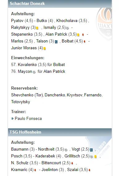 Провідне німецьке видання ставить оцінки гравцям обох команд (традиційно для німців найнижчий бал – круто, найвищий – дуже зле). Пятов і Болбат отримують по 4,5 – гірше за всіх інших. Жуніор Мораєс, Бутко в господарів, а також Крамаріч і Кадержабек у гостей не далеко втекли (по 4). Найкращі у Шахтаря Марлос та Ісмаїлі (по 2,5), у Хоффенхайма – Фогт, Грілліч і Біттенкур (по 2,5).