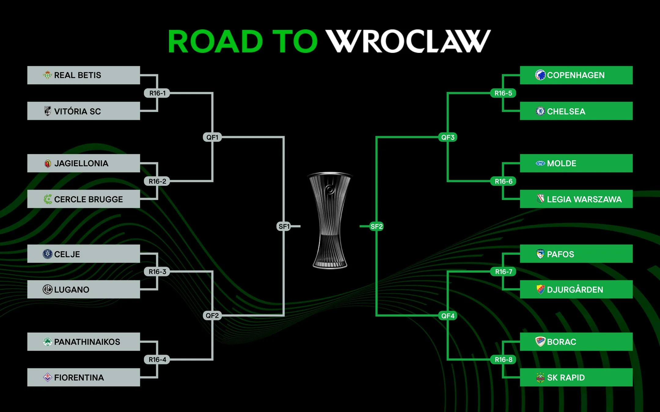 Процедура нічим не відрізнялась від ЛЧ та ЛЄ. Вісім найкращих команд основного етапу (вони сіяні – Челсі, Віторія Гімараєш, Фіорентина, Рапід Відень, Юргорден, Лугано, Легія та Серкль-Брюгге) зійдуться з вісьмома переможцями попереднього раунду плей-офф (несіяні – Целє, Панатінаїкос, Мольде, Яґеллонія, Бетіс, Копенгаген, Борац Баня-Лука та Пафос).