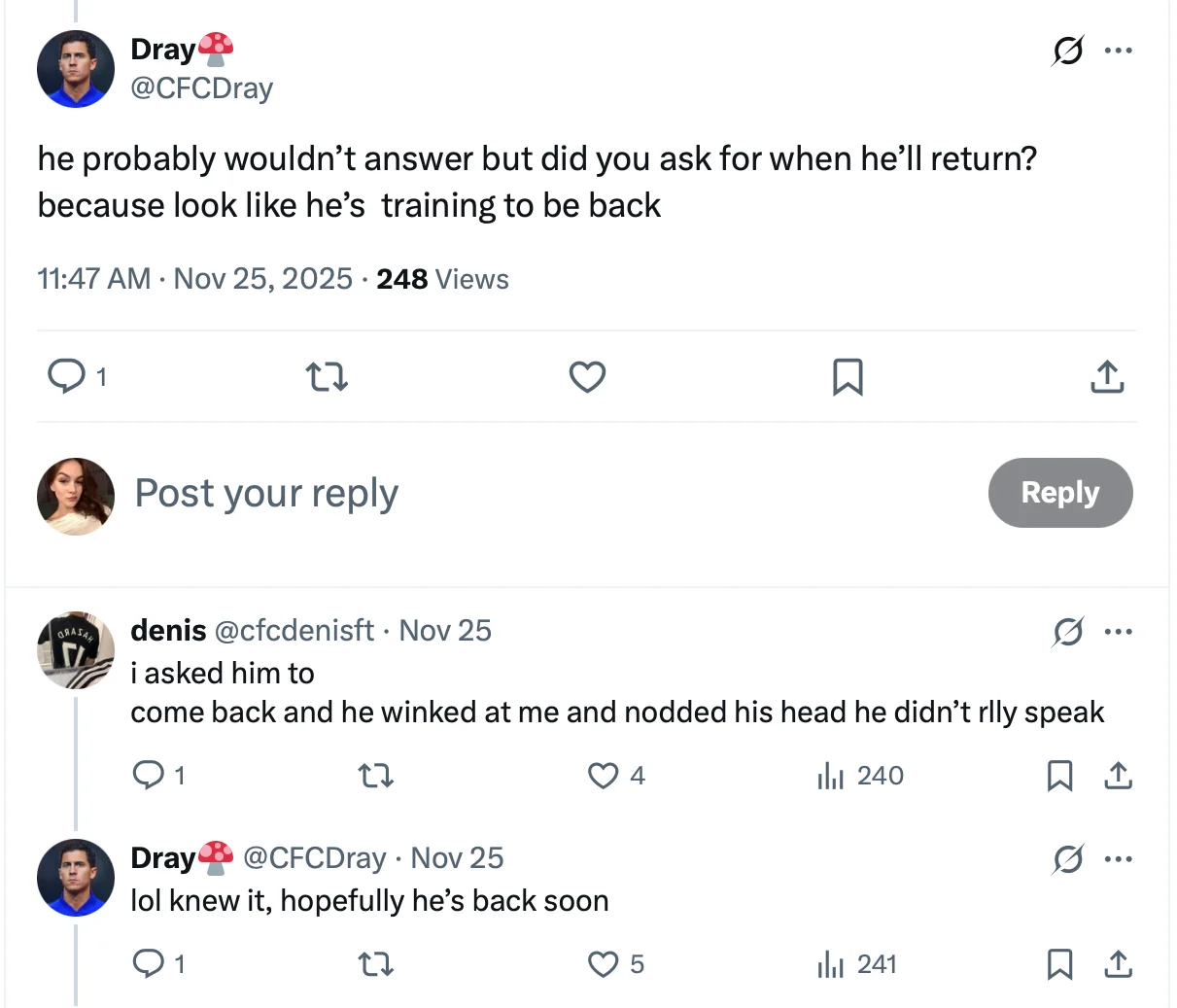 У коментарях під постом один із фанатів поцікавився, чи планує українець повернутися у футбол: "Виглядає так, ніби він тренується, щоб повернутися". На це автор посту відповів: "Я запитав і попросив його повернутися – він підморгнув і кивнув головою. Багато не говорив". Обидва вболівальники сподіваються на якнайшвидший камбек.