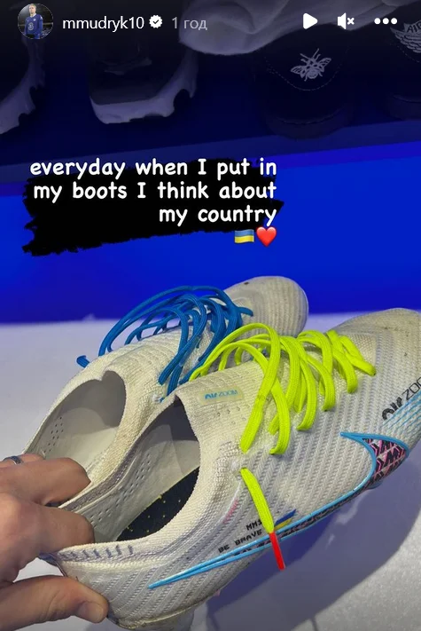 Михайло Мудрик у соцмережах показав свої бутси, у яких виходить на футбольне поле. На взутті є шнурівки синього та жовтого кольору, напис "будь хоробрим", а також прапор України, що нагадує футболісту про рідну землю.