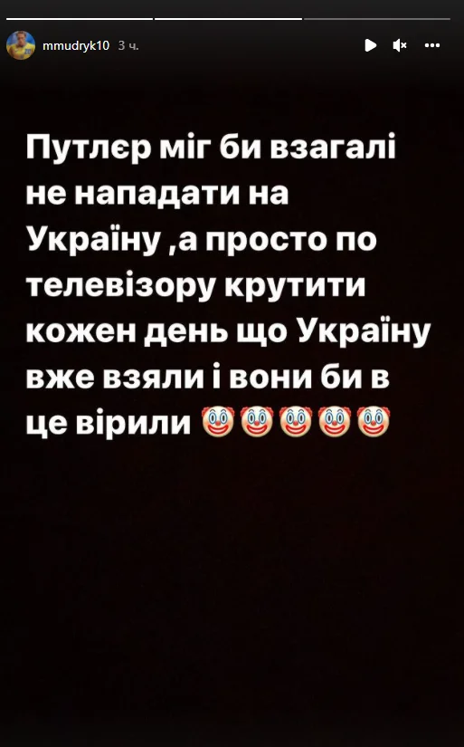 Путлєр міг би взагалі не нападати на Україну, а просто кожен день крутити по телевізору, що Україну вже взяли. І вони б в це вірили", – написав Мудрик на своїй сторінці у соціальній мережі Instagram.
