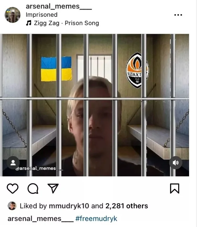 В одному з пабліків Арсенала опублікували мем, в якому Мудрика зобразили за ґратами, додавши на фоні емблему Шахтаря та прапор України.
