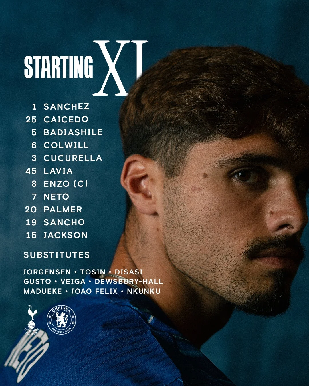 Стартовий склад Челсі: Санчес, – Кайседо, Бадіашиль, Колвілл, Кукурелья – Лавія, Енцо – Нету, Палмер, Санчо – Джексон.