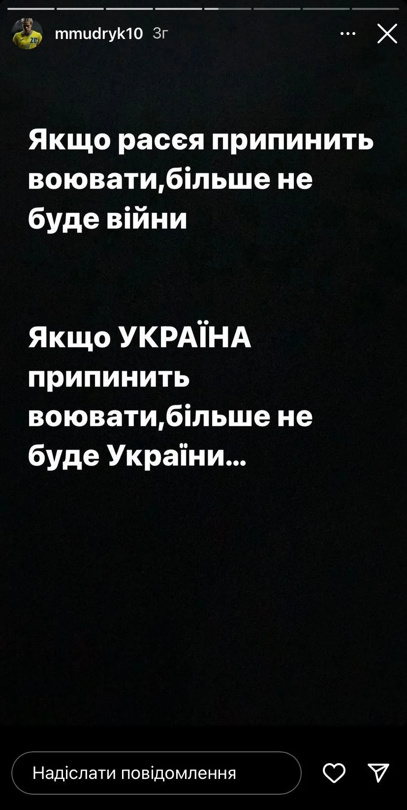 Якщо Україна припинить воювати, більше не буде України", – написав Мудрик у своєму Instagram.