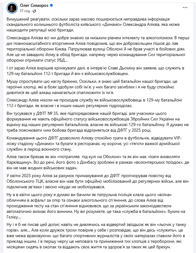 Мушу спростувати цю нахабну брехню. Оскільки я знаю цей батальйон нашої бригади, то не буду спокійно дивитися, як цей алкаш намагається спаплюжити їхнє ім'я. Олександр Алієв ніколи не проходив службу як військовослужбовець у 129-му батальйоні 112-ї бригади, як власне і в інших наших регулярних підрозділах. Він тусувався у ДФТГ № 35 (добровольче формування територіальної громади, – прим.), яке підпорядковане нашій бригаді, але учасники цього формування не мають офіційного статусу військовослужбовців Збройних Сил України, на відміну від наших регулярних батальйонів, власне як військові 129-го батальйону. Думаю не треба пояснювати, чим бойова бригада відрізняється від ДФТГ у 2025 році.