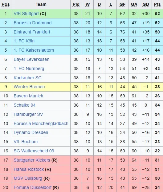 Цікаво, що усі претенденти на титул у заключному турі грали на виїзді. Отже, для чемпіонства BVB потрібно було сподіватися на втрату очок обома конкурентами. І цей, на перший погляд, малореальний сценарій реалізовувався майже до завершення цього вражаючого трилера. На 9-й хвилині гол Шапюїзи дав лідерство "чорно-жовтим", а Штутгарт та Айнтрахт горіли у Леверкузені та Ростоку. Невдовзі фаворити відновили статус-кво. Але нічия для них була рівноцінною поразці. На 80-й хвилині форвард Айнтрахта Лотар Зіппель забиває гол у ворота Ганзи і приносить титул франкфуртцям. Так видавалося кілька секунд. Проте суддя скасував цей м’яч на вагу золота, зафіксувавши офсайд. У Леверкузені Маттіас Заммер, який тоді захищав кольори Штутгарта, не витримав напруги та був вилучений за суперечки з арбітром. Видалося, що цим захисник поставив хрест на чемпіонських амбіціях швабів. Але на 86-й хвилині Гвідо Бухвальд забиває гол, який для Штутгарта, що грав у меншості, став золотим. Шваби святкують, а Дортмунду довелося задовольнитися сріблом.