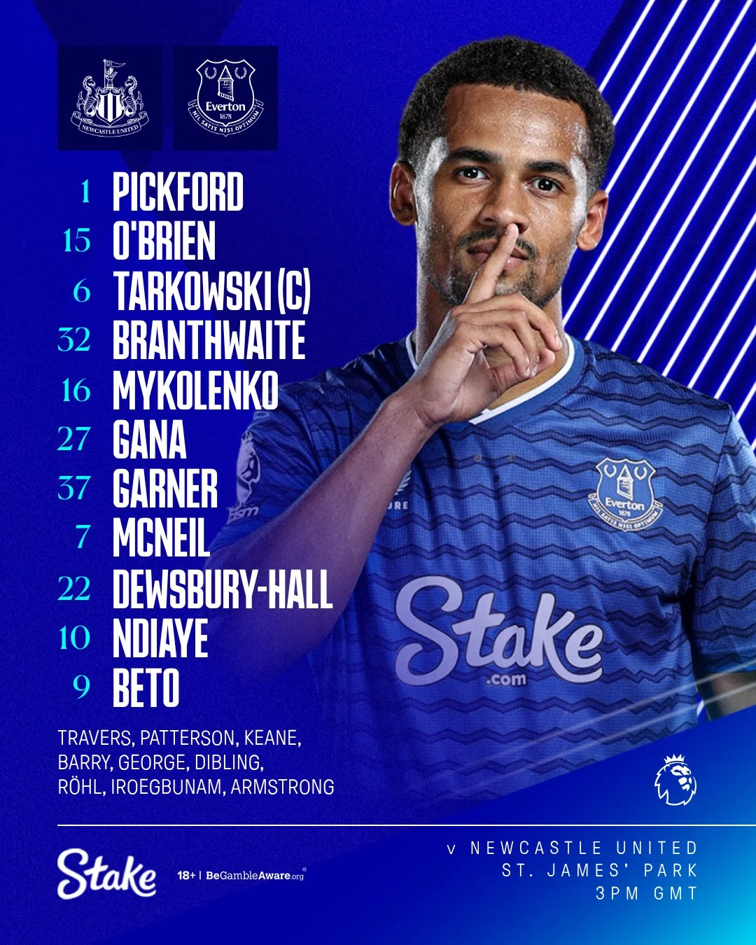 Пікфорд – О'Браєн, Тарковскі, Брентвейт, Миколенко – Гана, Гарнер, МакНіл – Дюсбері-Хол, Бету, Ндіає