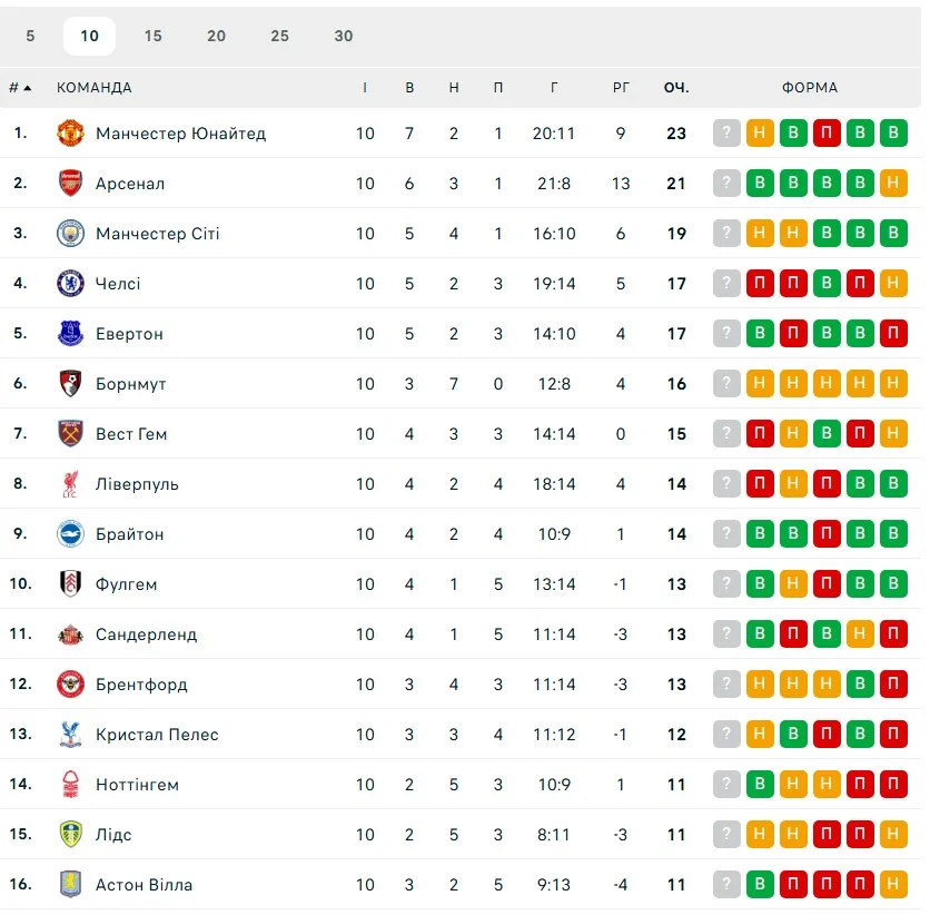 Турнірна таблиця АПЛ 2025/26 на дистанції останніх 10 турів