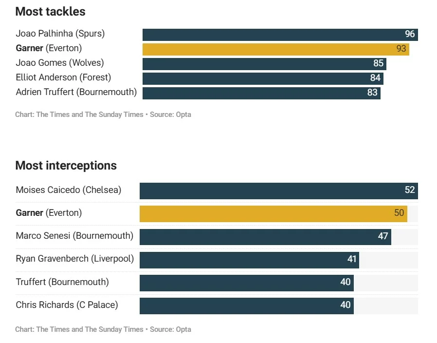 Джеймс у поточному сезоні дуже далекий від застарілого поняття опорників. Це Калюжному Ребров у матчі проти Швеції кричав, аби той сідав нижче, а не біг вперед, бо для атаки в нас мали бути інсайди Ярмолюк і Судаков, які, щоправда, наче навіть з більшим задоволенням опускалися нижче. Гарнер же здійснює вплив на обох кінцях поля. Лише Бруну (24), Шеркі (15) та Райс (14) створили більше стовідсоткових моментів, при тому що обидва гранди Манчестера та Арсенал якось більше грають з м'ячем, ніж Евертон, який перебуває на 15 місці АПЛ з 43,6% володіння в середньому за матч.
