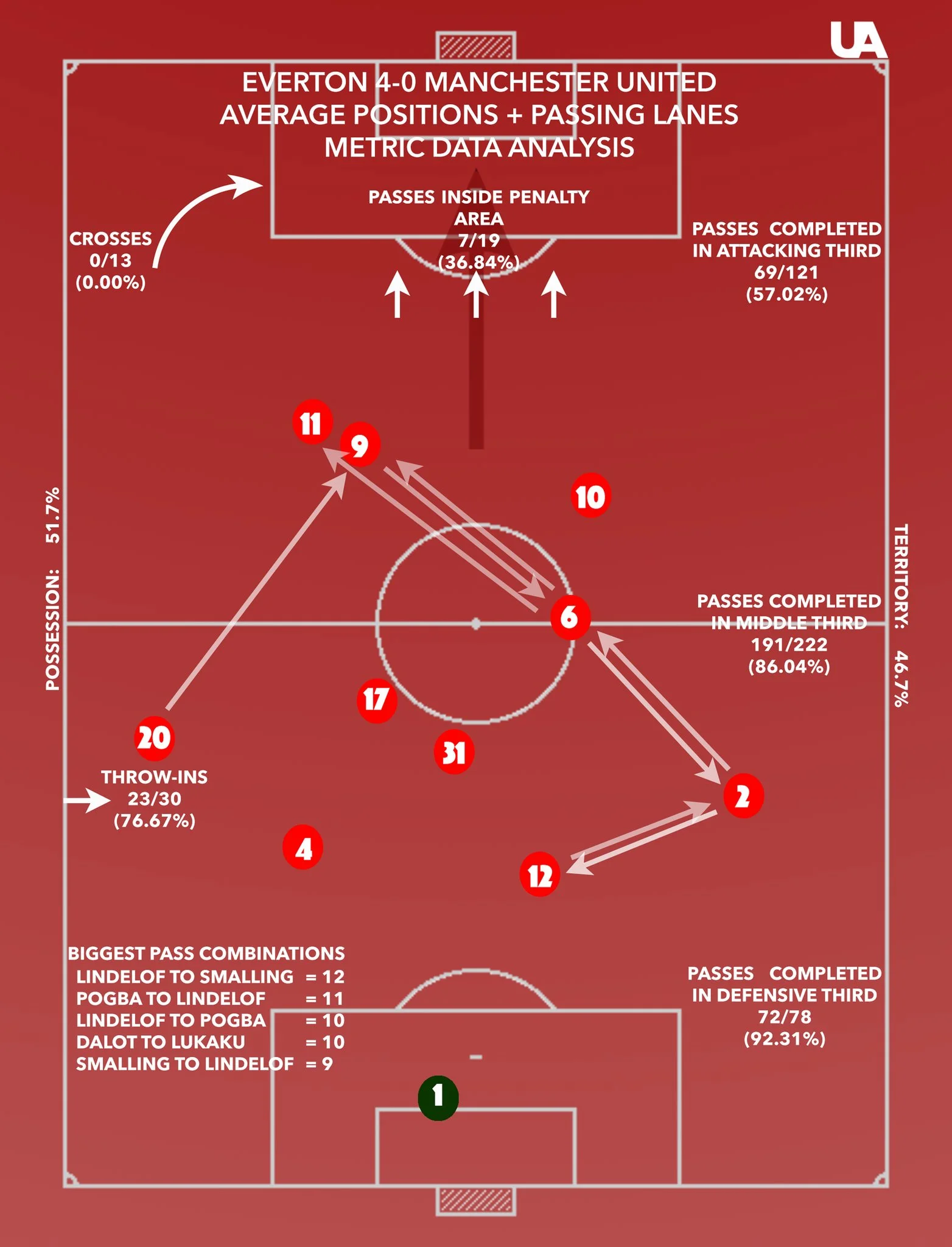 Так виглядає карта передач Манчестер Юнайтед на Гудісон Парк. Через переведення Ліндельофа на бровку центр захисту втратив гравця з першим пасом, а одним з найпопулярніших варіантів виходу з оборони були діагоналі Далота на Лукаку. У перерві Сульшер вніс корективи, які, втім, не допомогли. Позиційна гра Юнайтед жахлива.