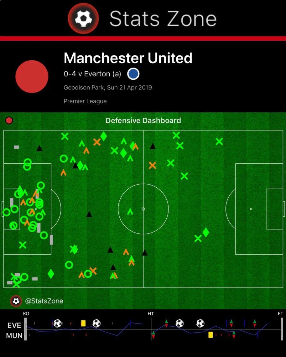 А це оборонна карта "дияволів" у звітному поєдинку. Евертон мало атакував через центр, бив по слабких сторонах суперника на флангах, однак Юнайтед нічого з цим не міг вдіяти. Після абсолютно справедливих 0:4 проти середняка до тренера є питання.