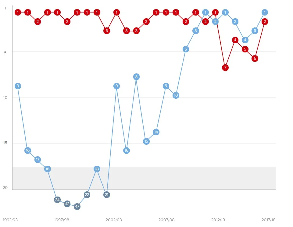 Місця Юнайтед (червоні) та Сіті (блакитні) в епоху АПЛ: