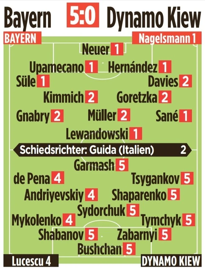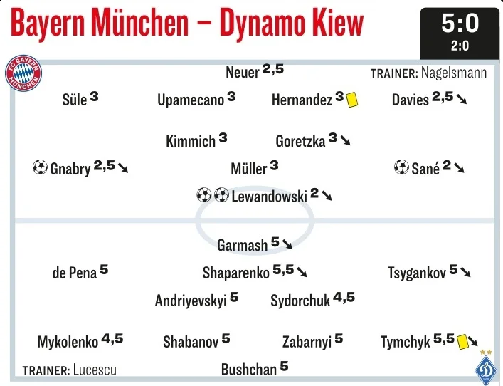 Журналісти Kicker поскупилися на хороші оцінки для своїх футболістів. Нікому не поставили найвищий бал – одиницю. Двійки лише в Сане та Лєвандовскі. У складі Динамо кращими балами виділили Сидорчука та Миколенка – не 5, а 4.5.