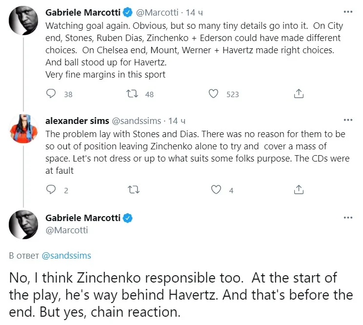 – Передивляюся гол, так багато деталей. У Сіті інші рішення могли прийняти Стоунз, Діаш, Зінченко та Едерсон. У Челсі навпаки Маунт, Вернер і Хаверц прийняли ідеальні рішення. І відскок м'яча допоміг Хаверцу.