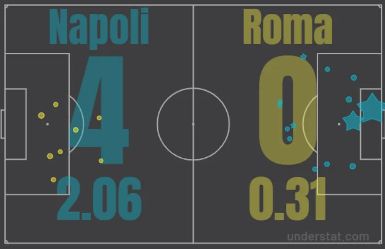 Рома, схоже, просто не вийшла на зустріч. Після непоганих стартових хвилин римляни втратили ініціативу й майже не контратакували, за весь матч отримавши лишень півтора шанси на гол – після удару Педро на 3-й хвилині та з невдалого пострілу Крістанте на 34-й. Загалом, з восьми ударів по воротах Мерета жоден не досягнув показника 0,1 xG, а середня їхня вага склала 0,039 xG (проти 0,147 xG у Наполі).