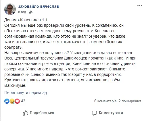 Руслан Свірін підкреслив, що результат матчу влаштував Копенгаген. "Не навчилися ще гравці сьогоднішнього Динамо в туман перемагати після пропущеного м'яча", – підсумував журналіст.