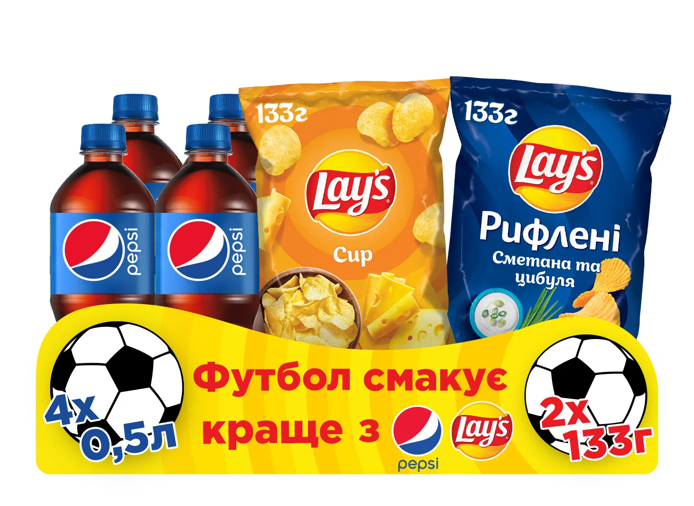 Футбол смакує краще з Lay's і Pepsi! Дивися топові матчі Ліги чемпіонів та вболівай за своїх фаворитів із боксом для справжніх уболівальників – мікс улюблених чипсів у поєднанні зі смачним напоєм ідеально підійдуть для гучної компанії.