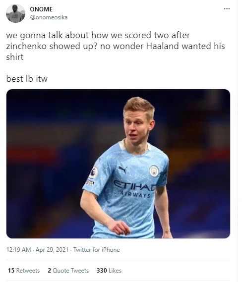 "Ман Сіті забив двічі після виходу Зінченка. Нічого дивного, що Холанд хотів його футболку", – один із найпопулярніших відгуків про Олександра за підсумками матчу з Парі Сен-Жермен.