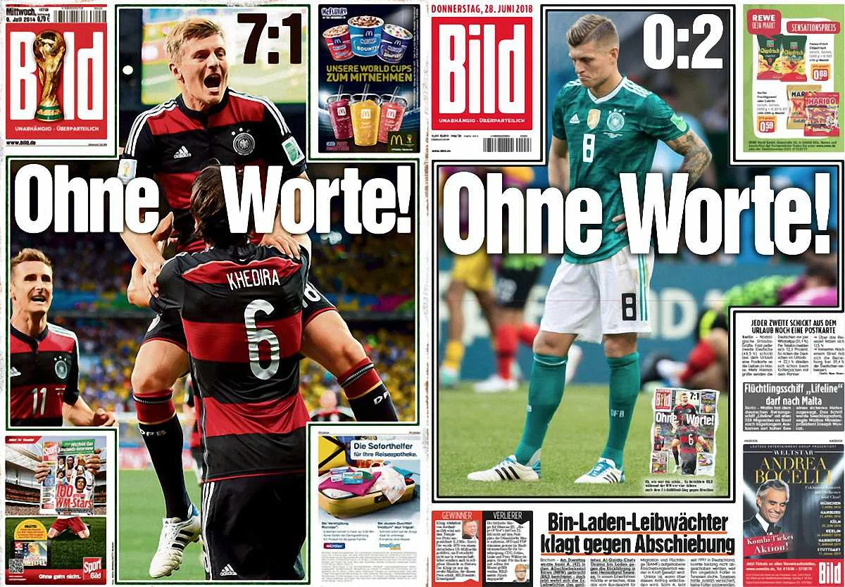 Найбільше Бундестім, звісно, дісталось від німецької преси, яка нещадно розкритикувала команду Льова за ганебний виступ на ЧС-2018. Bild, зокрема, обіграв поразку Манншафт від Південної Кореї з неймовірною перемогою Німеччини над Бразилією у півфіналі ЧС-2014. "Немає слів", – повторює популярне видання на своїй першій шпальті, однак вже з іншим підтекстом.