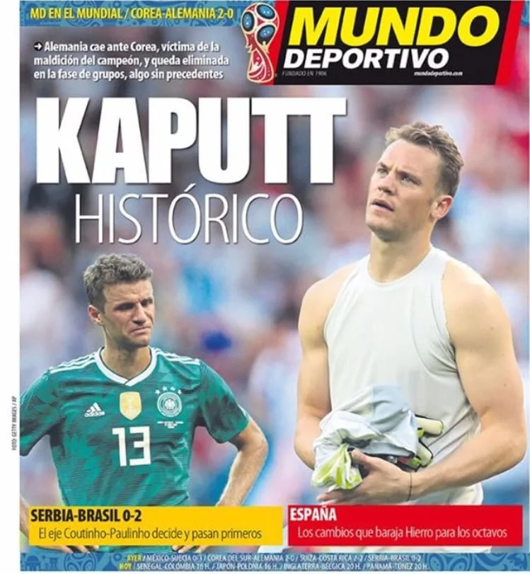 Дуже креативно підійшли до опису німецького фіаско в Барселоні. Першу шпальту місцевого видання Mundo Deportivo прикрасив заголовок "історичний капут". Каталонський ЗМІ згадує про знамените прокляття, але головним винуватцем невдачі Бундестім називає Льова, який, як і Дель Боске після ЧС-2010, вперто не хотів помічати завершення циклу своєї команди.