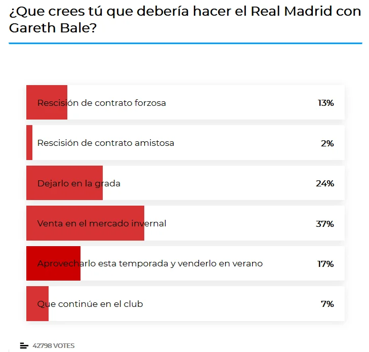 Крім цього, видання провело опитування серед читачів: "Що Реал повинен зробити з Бейлом?". Більшість респондентів (37%) вважають, що валійця потрібно продати у зимове трансферне вікно, трохи радикальніші фанати (24%) закликають клуб відправити скандального футболіста на трибуни.