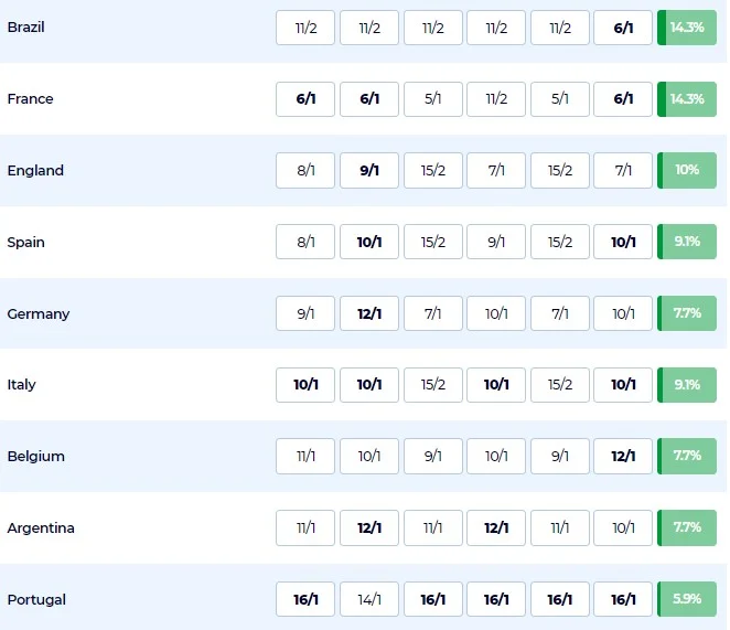 Тріумф Італії на Чемпіонаті Європи, який завершився 11 липня 2021 року, не змінив думок букмекерів. Як і проблеми України у відборі ЧС-2022. Команда Шевченка все ще стоїть вище за ту ж Польщу, яку ведуть за собою один з найкращих гравців планети Лєвандовскі та купа відомих виконавців з європейських топ-чемпіонатів. Чи за Австрію, якій ми програли без шансів на груповому етапі Євро-2020. А на вершині досі Франція, яка сенсаційно вилетіла на стадії 1/8 фіналу континентальної першості від Швейцарії.
