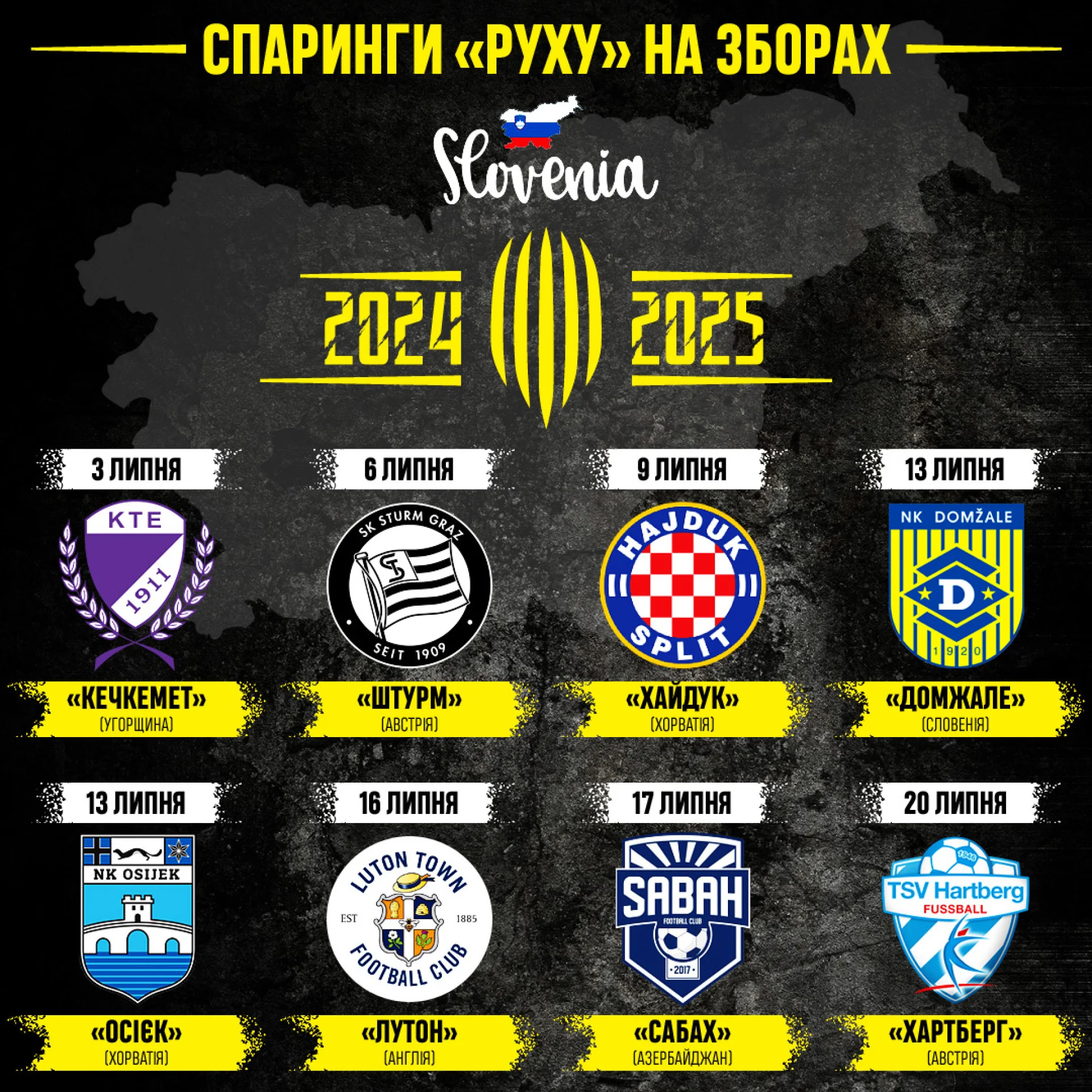 Рух проведе передсезонні збори у Словенії, повідомляє офіційний сайт "жовто-чорних". Це буде друга частина підготовки до сезону 2024/25. А перед цим команда готуватиметься на клубній навчально-тренувальній базі.