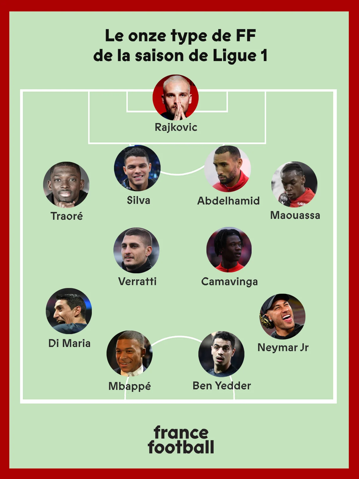 Предраг Райковіч (Реймс) – Хамарі Траоре (Ренн), Тьягу Сілва (ПСЖ), Юніс Абдельхамід (Реймс), Фаїтут Мауасса (Ренн) – Марко Вератті (ПСЖ), Едуардо Камавінга (Ренн) – Анхель Ді Марія (ПСЖ), Неймар (ПСЖ) – Кіліан Мбаппе (ПСЖ), Віссам Бен-Єддер (Монако).