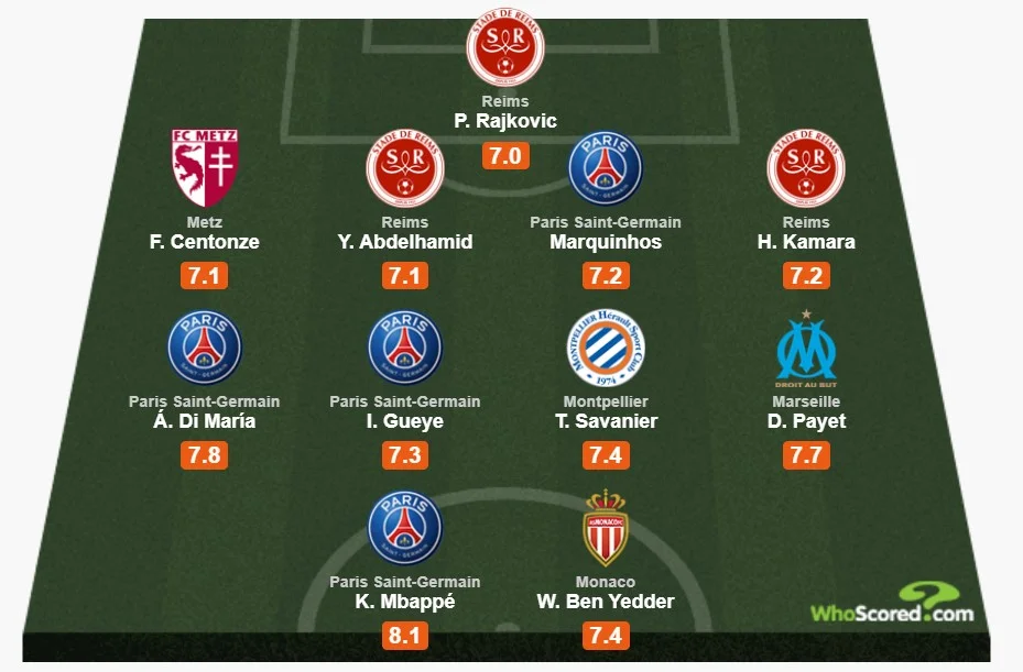 Предраг Райковіч (Реймс) – Фаб'єн Сантонз (Метц), Юніс Абдельхамід (Реймс), Маркіньйос (ПСЖ), Хассан Камара (Реймс) – Ідрісса Гейє (ПСЖ), Тежі Саваньє (Монпельє) – Анхель Ді Марія (ПСЖ), Дімітрі Пайє (Марсель) – Кіліан Мбаппе (ПСЖ), Віссам Бен-Єддер (Монако).