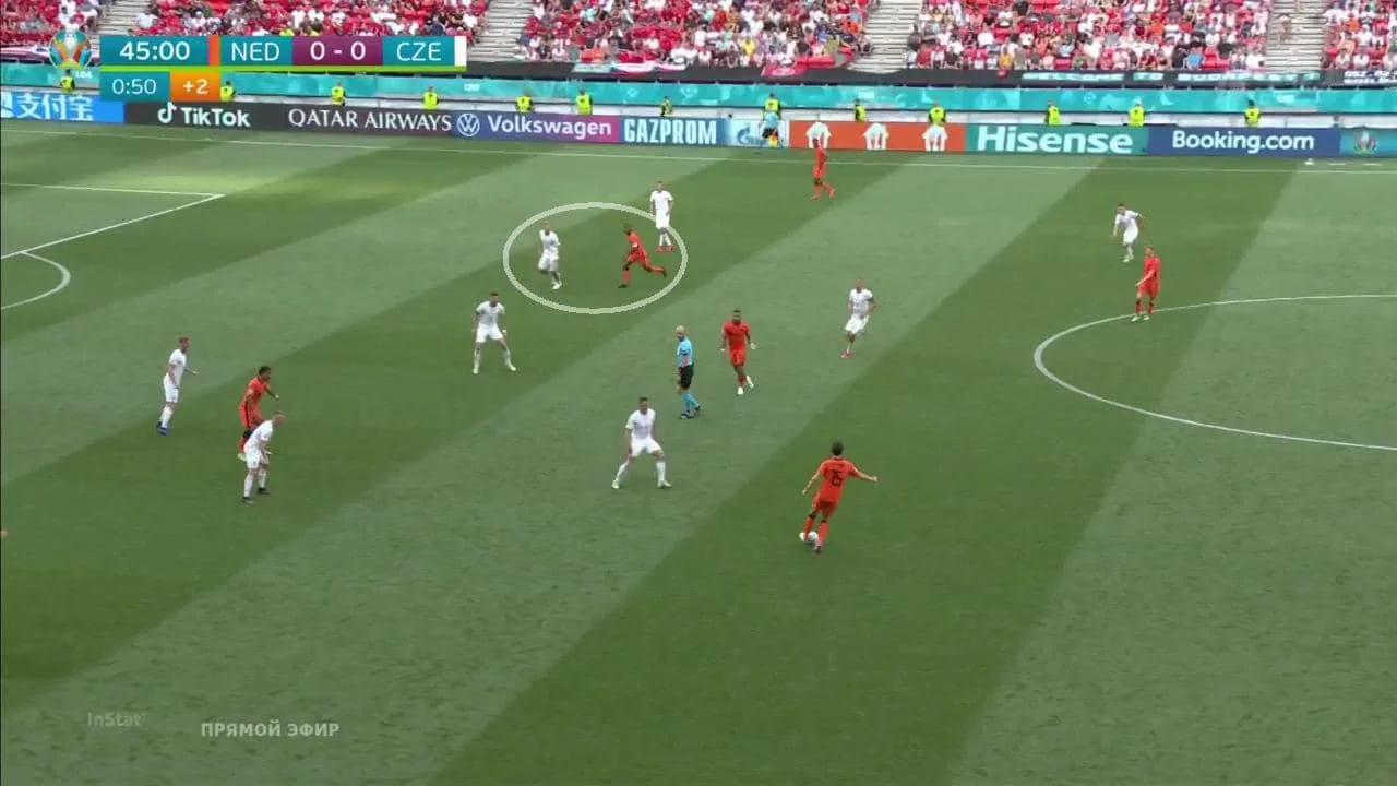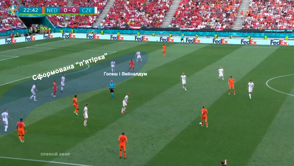 Чехія сповідувала той же стиль, що і Австрія з Шотландією. Той же високий пресинг, ті ж 39 пресинг-дій на чужій третині, той же відхід у п'ятірку захисників у позиційній обороні. Нічого нестандартного Ярослав Шилгави своєму візаві не запропонував – єдиним нововведенням стала персональна робота "народної команди" по Вейналдуму. "Пивовари" намагалися не дати Джорджінью виконувати фірмові ривки з глибини у штрафний та зону перед ним з подальшим обіграшем.
