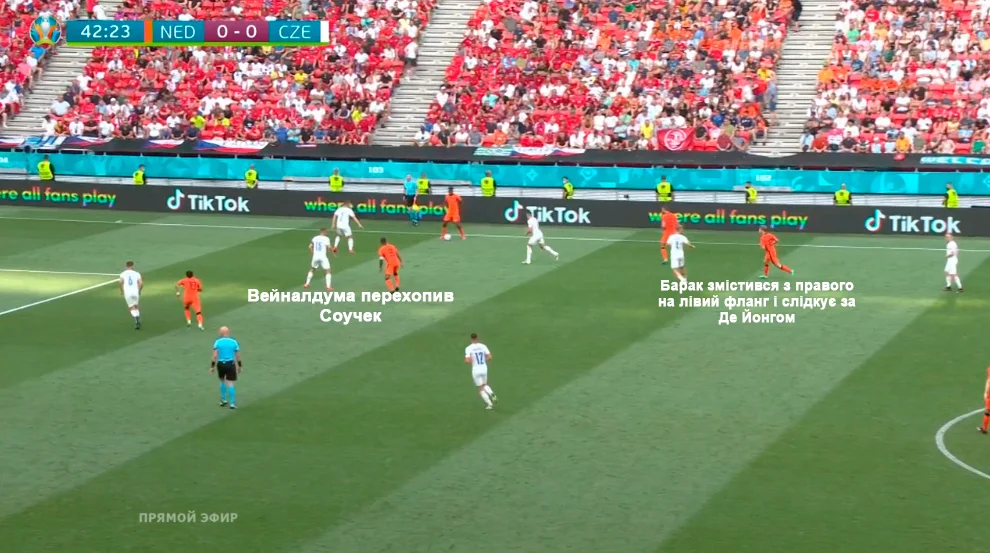 Часто Барак перемикався і на Вейналдума, сідаючи в оборонний блок. Нагадаємо, Антонін є нападником по природі й центральним атакувальним півзахисником у схемі збірної Чехії.