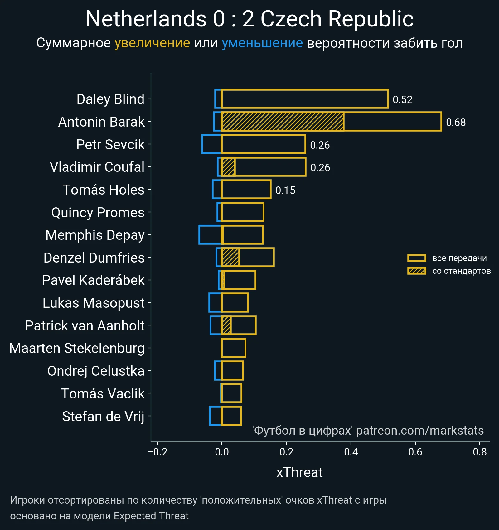 Втім, списувати усі проблеми на індивідуальні провали неправильно. Фіаско зазнала уся команда, а першопричина полягала у відсутності ідей щодо зміни малюнку гри. Чехія методично душила "ораньє" агресивним тиском на чужій третині, а Нідерланди сипались, збиваючись на довгі передачі. У матчі проти "пивоварів" їхня частка перевалила за 14%, в той час як у групі показник не підіймався вище 10,6% (у поєдинку з Австрією). "Коронним" маневром став пас назад на Стекеленбурга з подальшим виносом – 70% його передач виявились довгими.