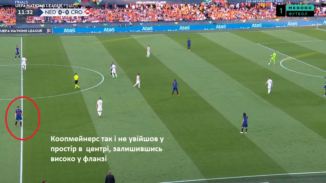 Нідерланди скопіювали модель Манчестер Сіті при грі на м'ячі, вибудовуючись у схему 3-2-2-3, що дозволило б кількісно задавати центральну трійку Хорватії – втім, Коопмейнерс не приймав м'яч між лінями, а відкривався аж біля нападників. Як наслідок, центрбекам "картатих" не треба було підійматись за Теуном, а центрхави могли за ним не опускатись.