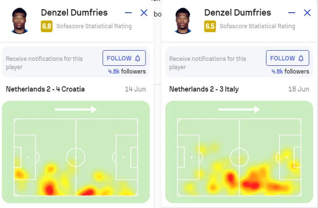 Дюмфріс у такій моделі міг активніше виконувати ривки правим флангом, чого не було у півфіналі. Теплова карта Дензела красномовна.