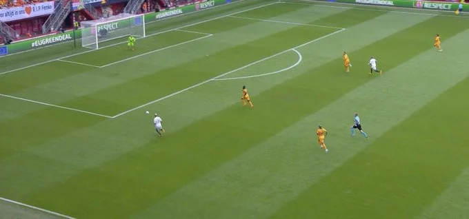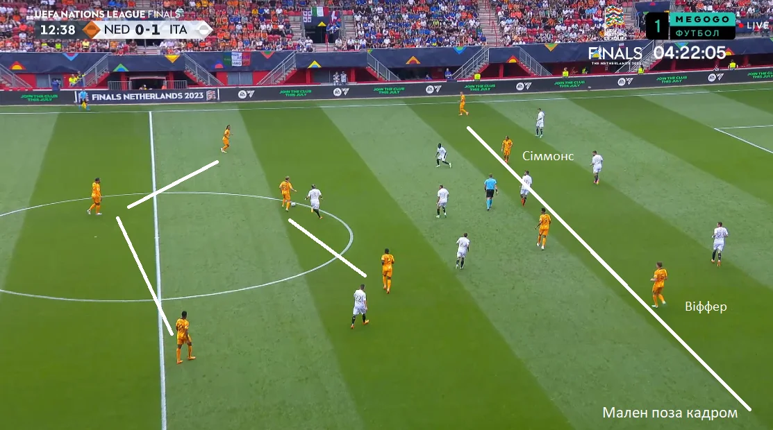 "Ораньє" тиснули і, зрештою, забили гол. Гакпо та Коопмейнерс обігрались у центрі, після чого пішло закидання у карний майданчик. Зрізка від одного із захисників запустила "свічку" – Бергвейн підхопив відскок, хитнув Дімарко й пробив у дальній кут. 1:2!