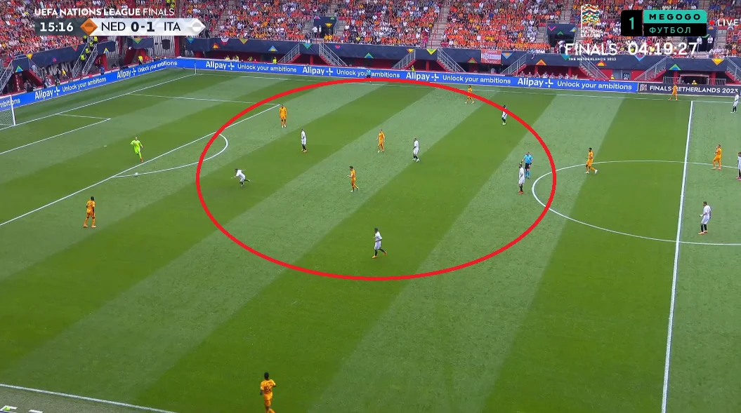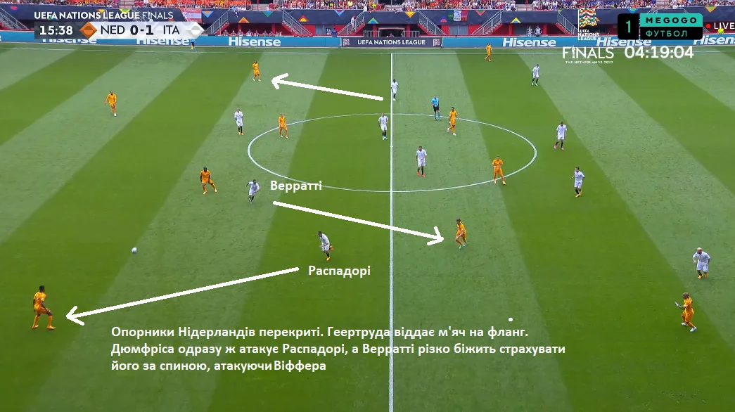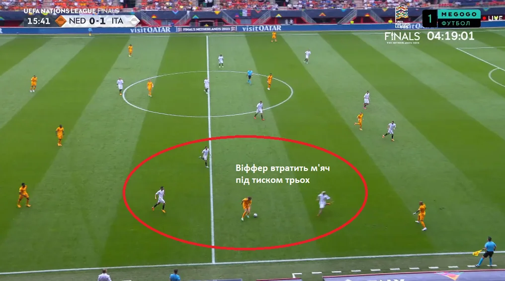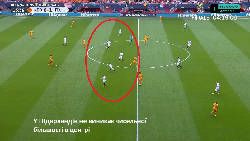"Ораньє" доводилось компенсувати якість роботи на чужій третині кількістю. Вони втягувались туди великою кількістю футболістів, катали м'яч взад-поперек – і зрештою втрачали його. Після цього Італія вмикали флангові контратаки. Благо, зон вистачало.