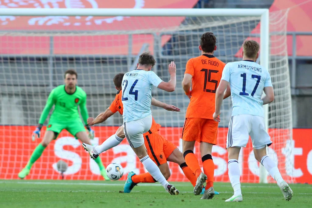 Шотландія відповіла на удар Думфріса дальнім пострілом центрбека Тірні. М'яч пролетів повз дальній кут. "Ораньє" розіграли удар від воріт через пас низом, але суперник настільки агресивно накрив їх пресингом, що Депай втратив м'яч на власній половині. Армстронг тут же віддав передачу на Хендрі (теж центрбека), а Джек несильно пробив метрів з 23-х – точно в лівий нижній кут! 0:1. Ще за дві хвилини Дайкс міг подвоїти перевагу, увірвавшись на правий край штрафного, але його подальший постріл парирував Крул.