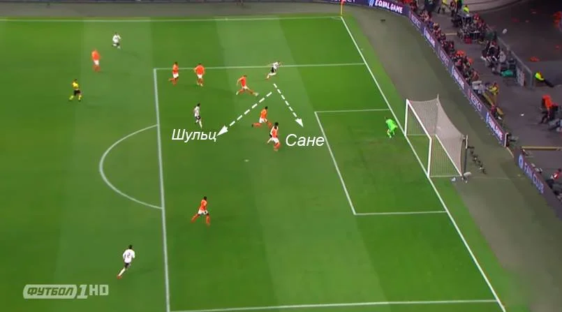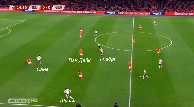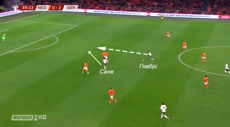 Так, у першому голі німцям вдалося створити ізоляцію для швидкого Шульца та Сане. Вона стала наслідком високого пресингу Нідерландів, яким німці дуже добре маніпулювали – Ван Дейк високо зустрічав Гнабрі, Думфріс висмикнувся на Крооса, а за латералем та Сане слідкував лише один Де Лігт.