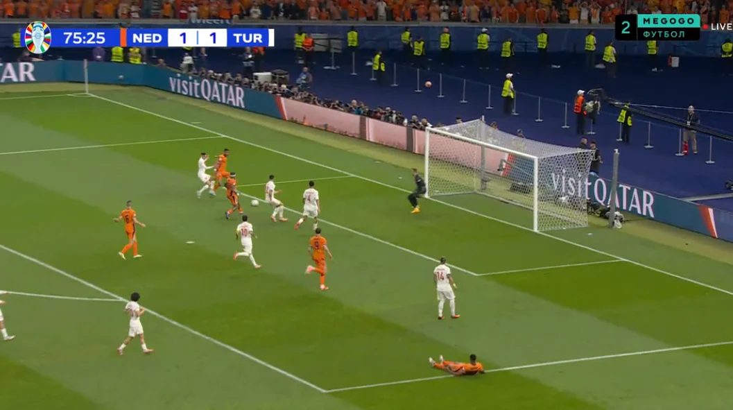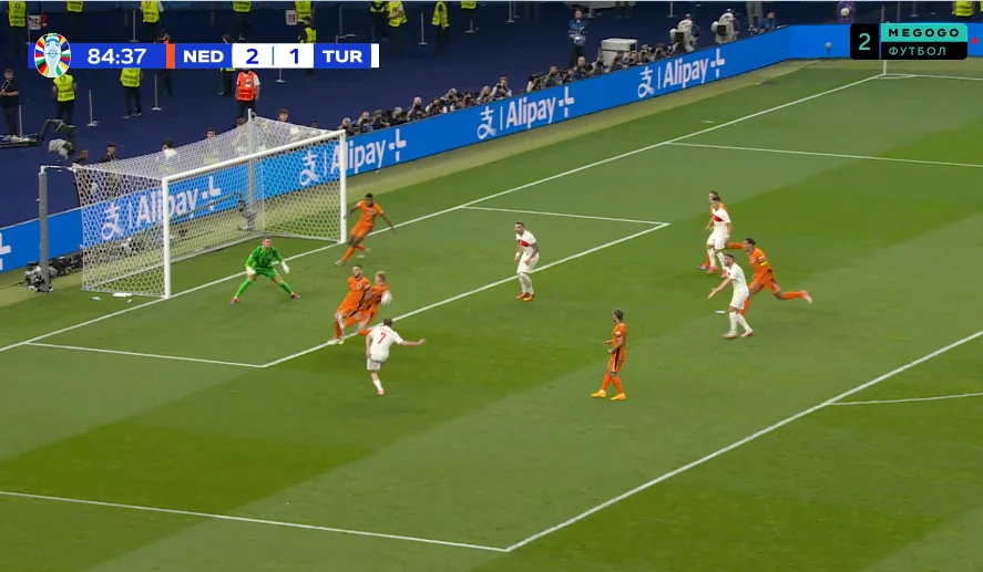 Далі пішла атака другим темпом з подачею, яку на лівому краю штрафного підхопив Актюркоглу. Керем теж завдав удару з близької відстані. Тепер вже Де Врей і Схаутен кинулись під м'яч!