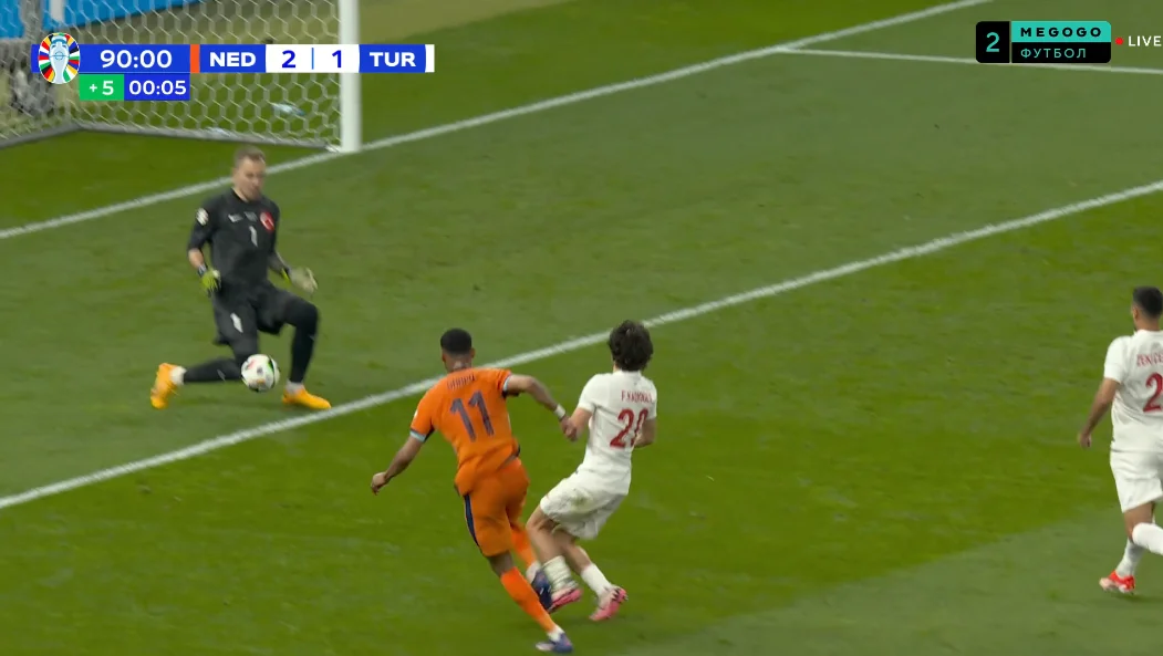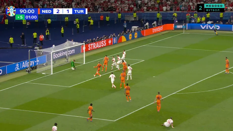 Подальший кутовий виявився фатальним для Туреччини. Розіграш завершився подачею Депая точно на голову Де Врею – Гюнок не виручив. 1:1! Рахунок зрівнявся.