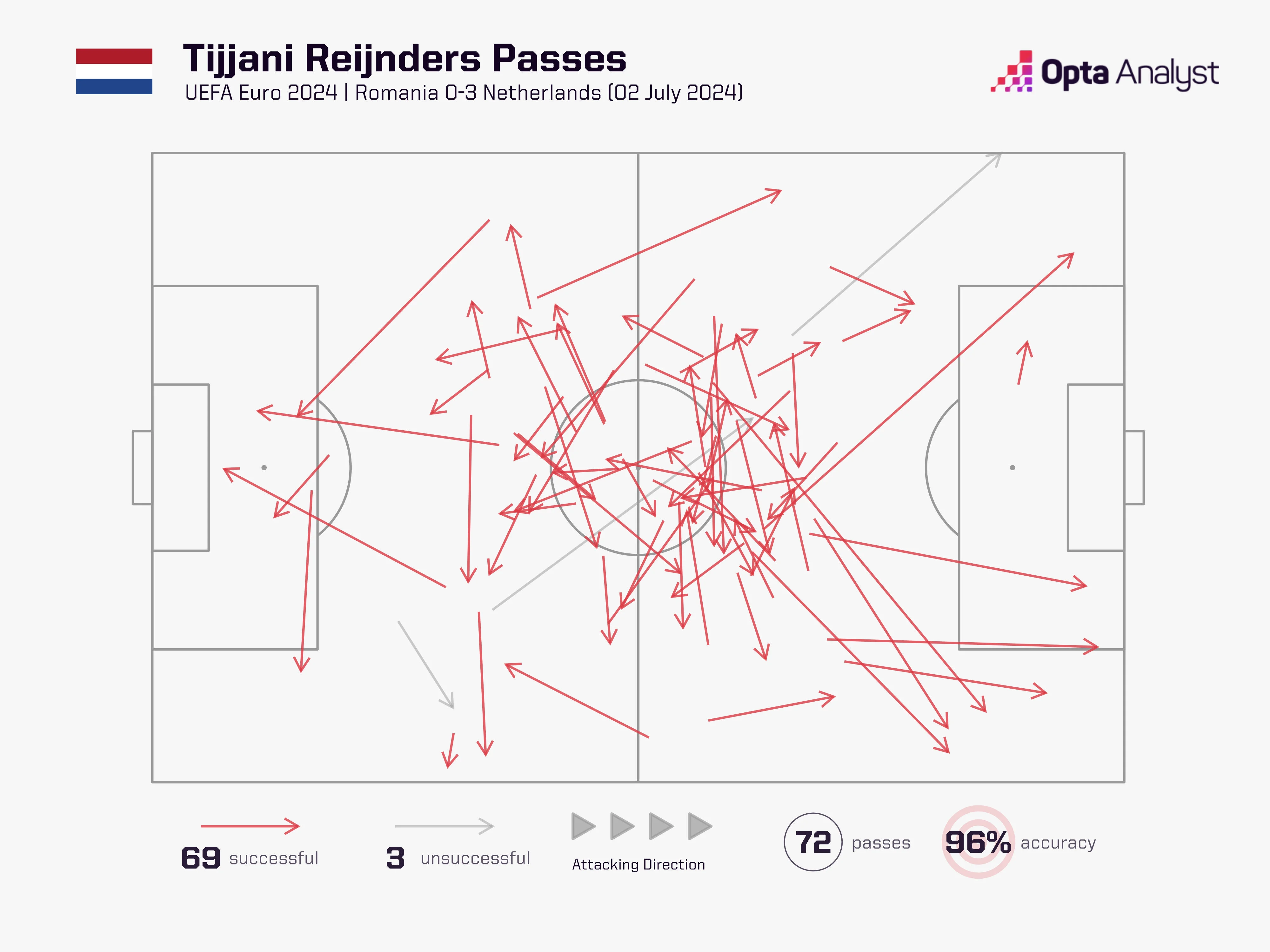 Схаутен, Рейндерс і Сіммонс стараються замінити його спільними зусиллями. Перший гол у ворота Румунії стався саме після відкривання Рейндерса в опорній зоні під своєчасний пас Схаутена, а Сіммонс лідирує на Євро-2024 за асистами (3 штуки). І все одно "ораньє" бракує стабільності в цій роботі, хоча за мірилами Англії та Франції команда демонструє космічну дистрибуцію.